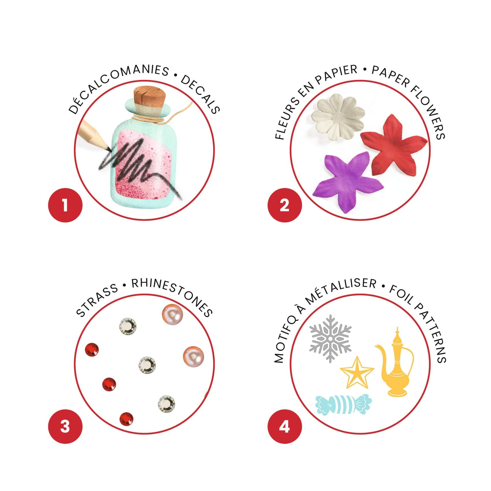 - Includes 4 sheets of decals, 30 paper flowers, 100 self-adhesive rhinestones and various patterns to decorate with foil and a step-by-step instruction booklet