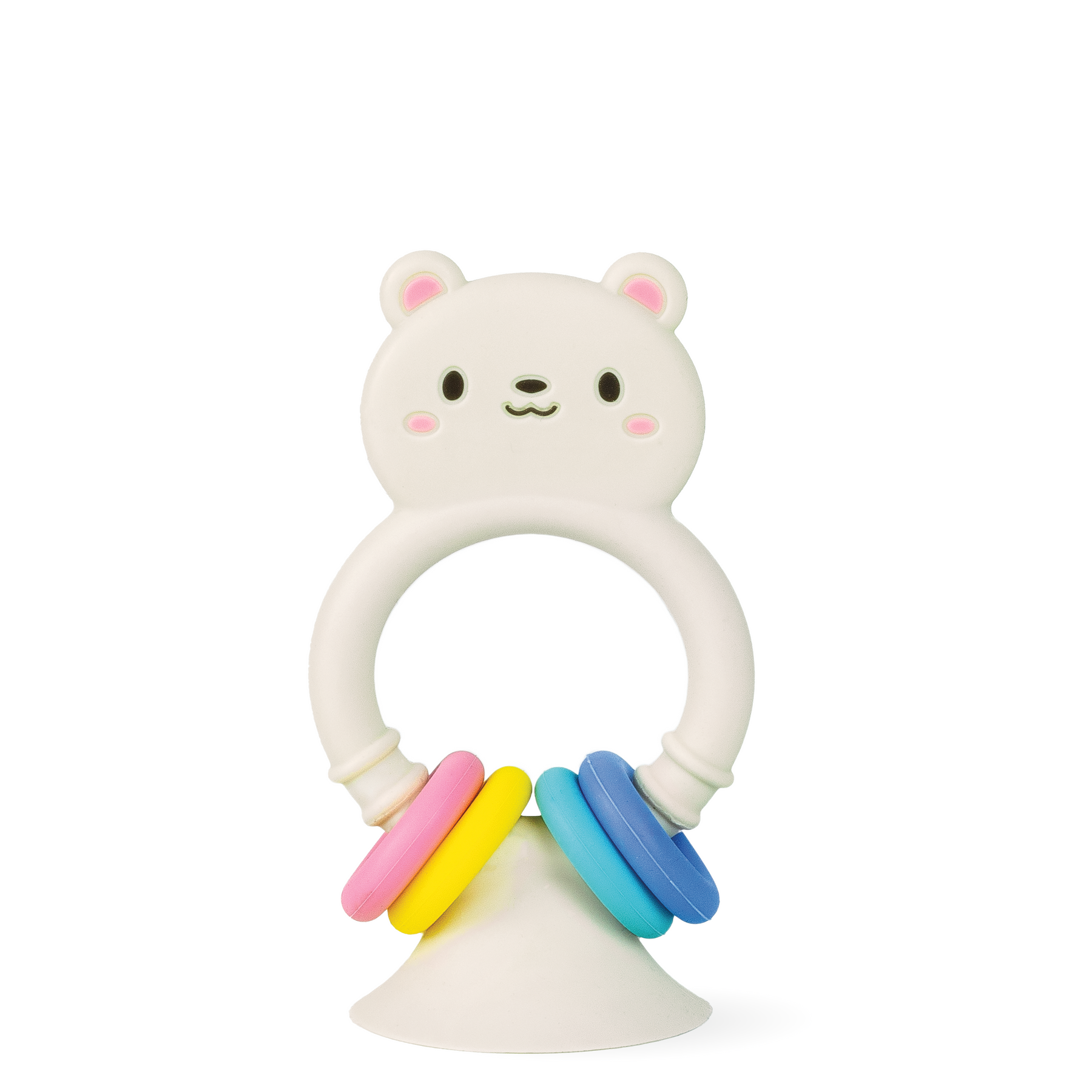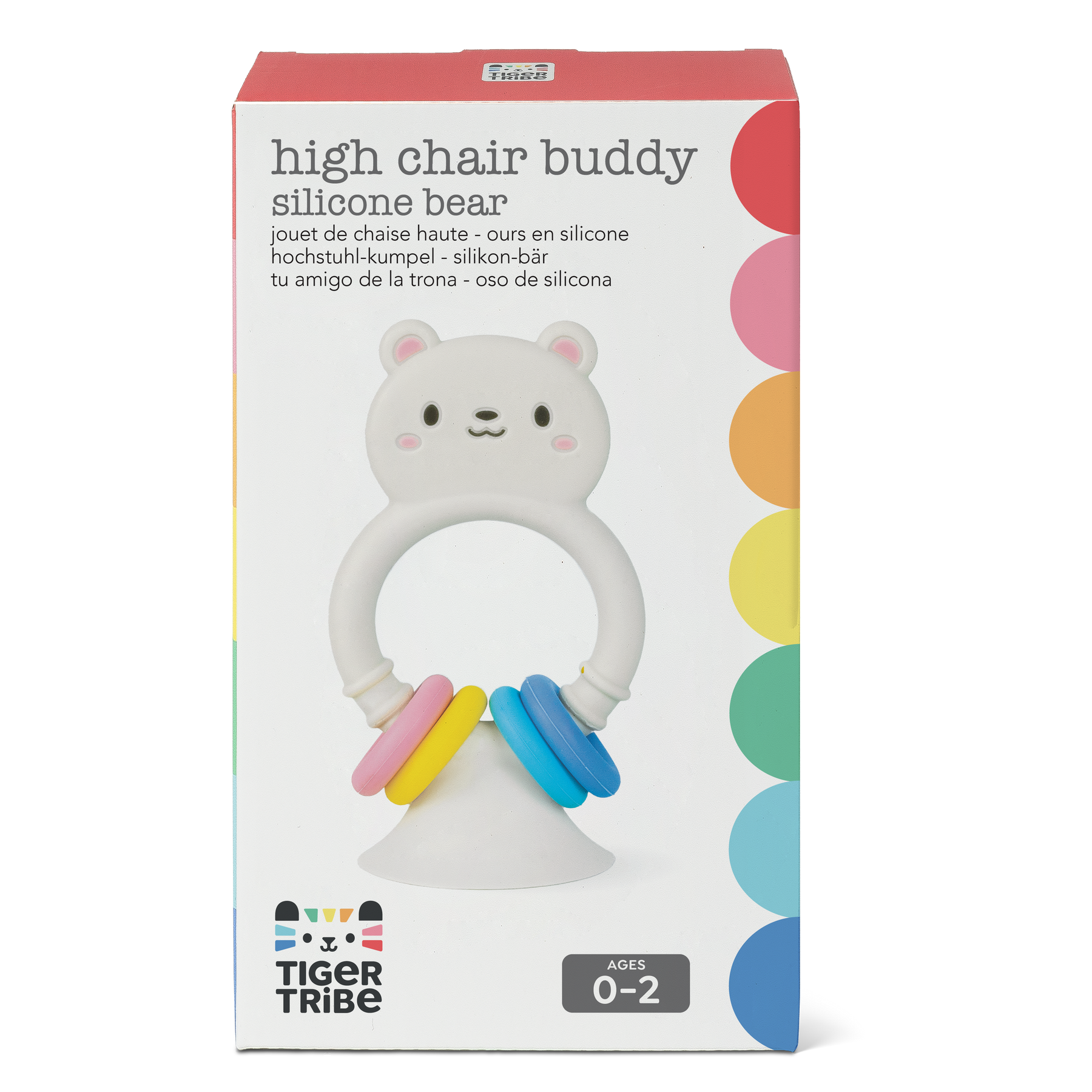 • Includes a soft, food-grade silicone bear high-chair toy with an attached suction-cup base and three colourful movable rings for sensory play