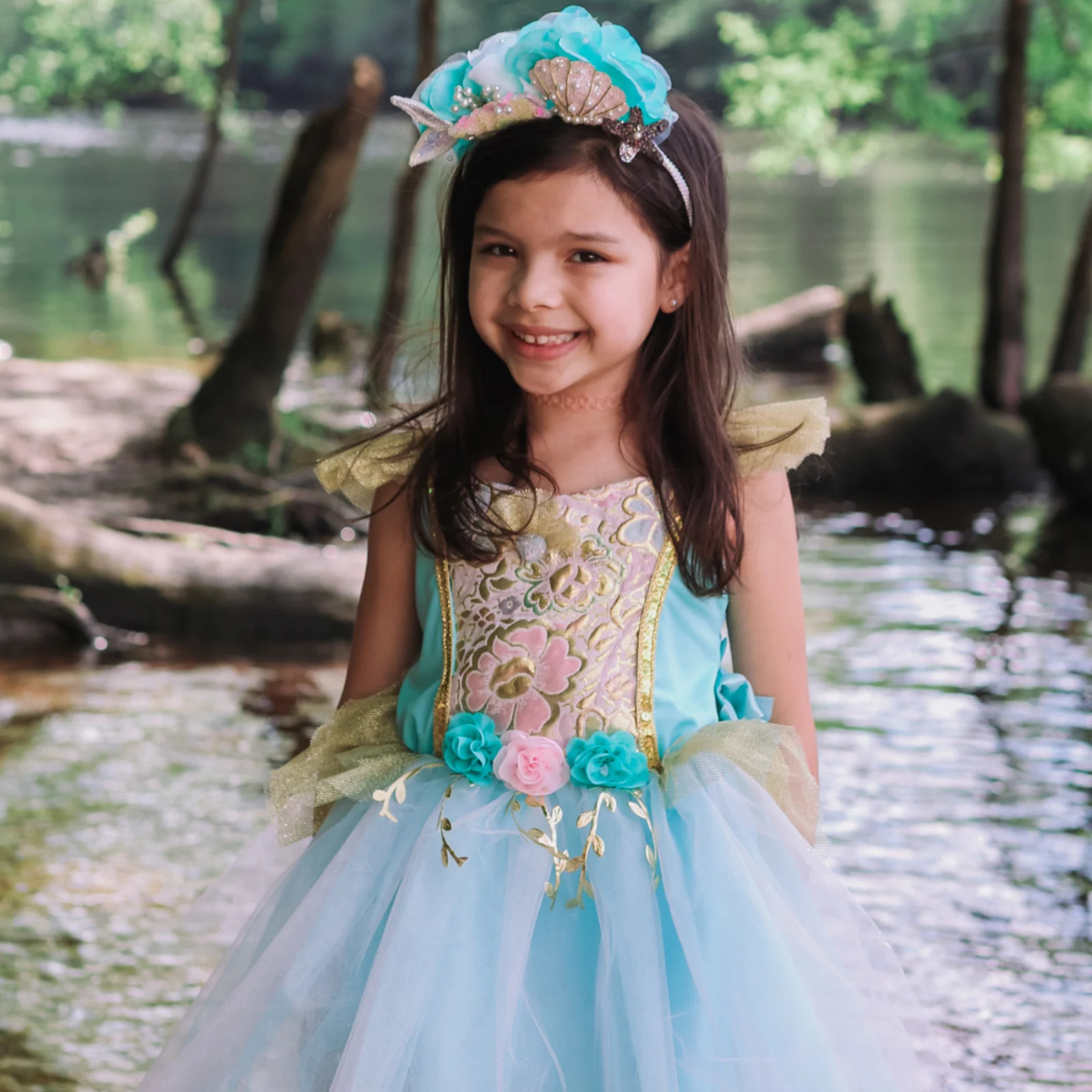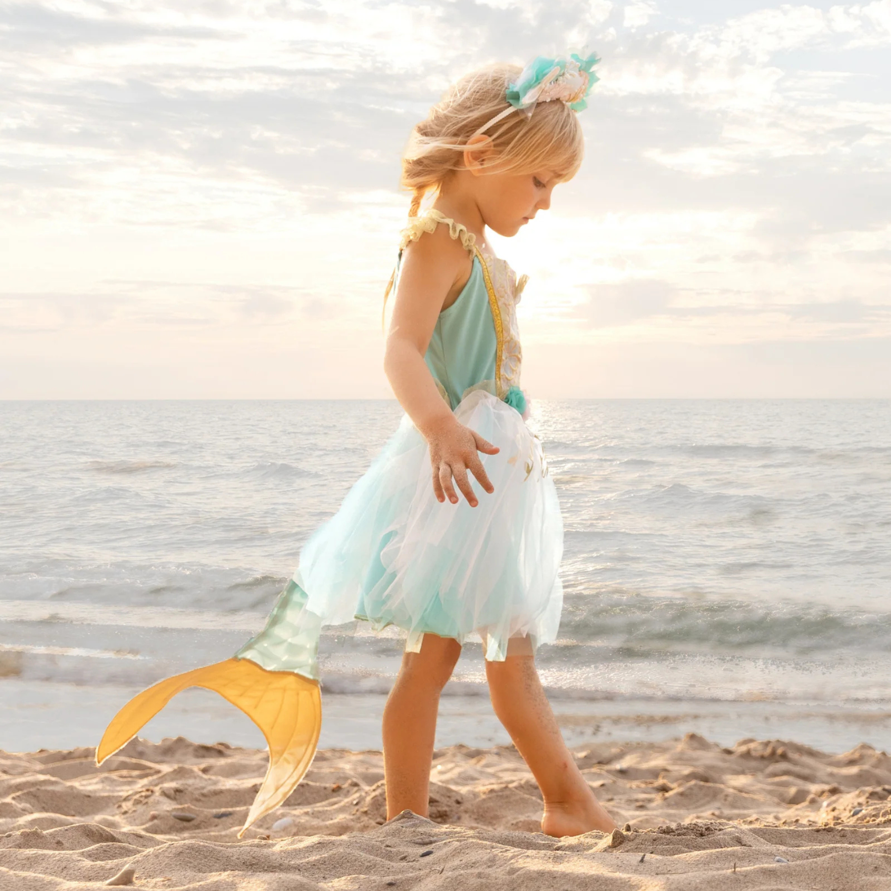 Mermalicious Dress & Tail Play Costume Set by Great Pretenders. Designed with beautiful teal and gold accents, this stunning Mermalicious Dress is guaranteed to make your little one the most fashionable mermaid both on land and in the sea!