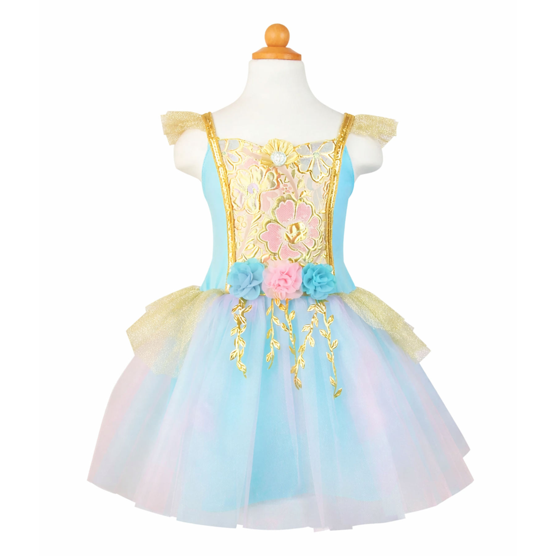 It features a gorgeous ocean palette of light blues, aquas, pinks and purples. Embellished with laser-cut roses, leaves and gold trimmings on a sea blue shimmery skirt, the colours are rich and luxurious. The elasticated waistband allows for size flexibility.