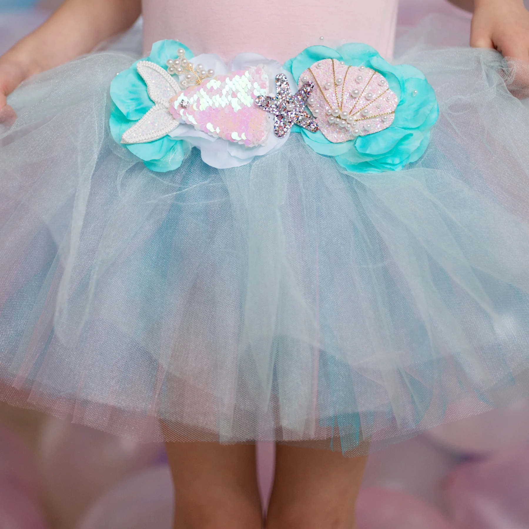 - Includes tulle tutu skirt with iconic embellishments of a mermaid tail, sea shells, a star fish and ocean pearls