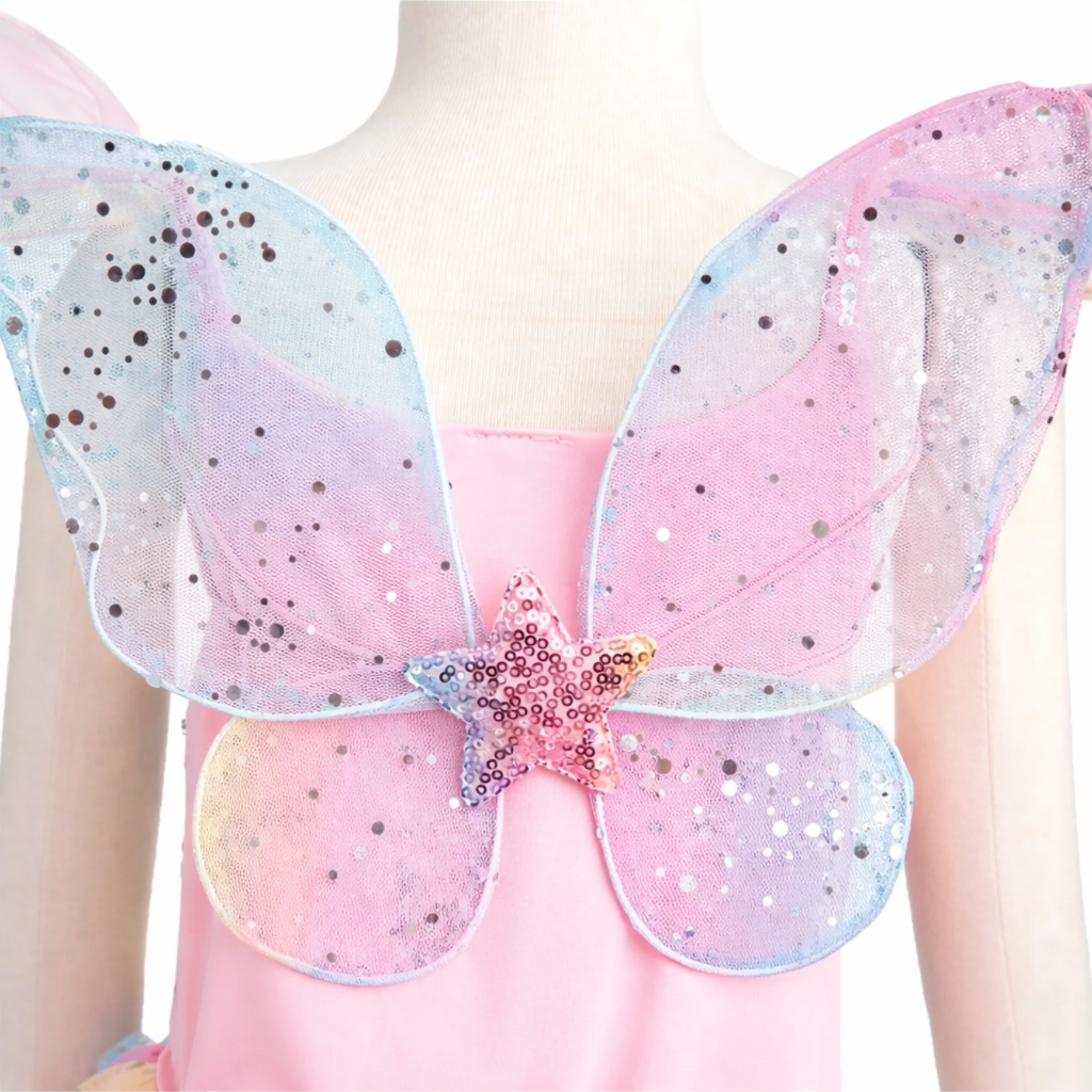 The top is made with rainbow sequinned detailing. Shimmery organza capped sleeves on soft and stretchy straps elevate this dress. The matching wings are made with a rainbow mesh fabric with a sequinned star in the centre.