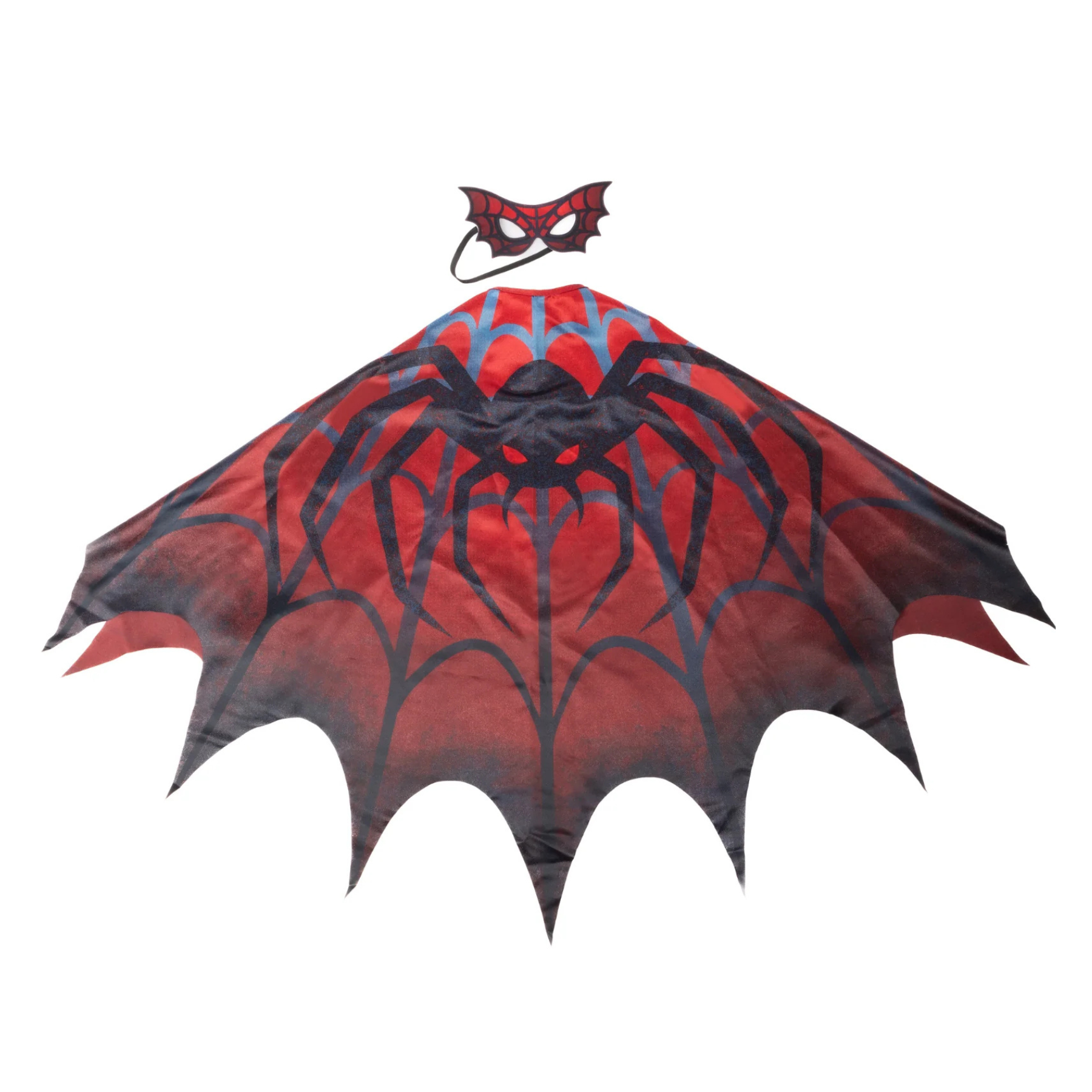 - Includes web-pattern soft wing cape with arm loops and a matching spider eye mask