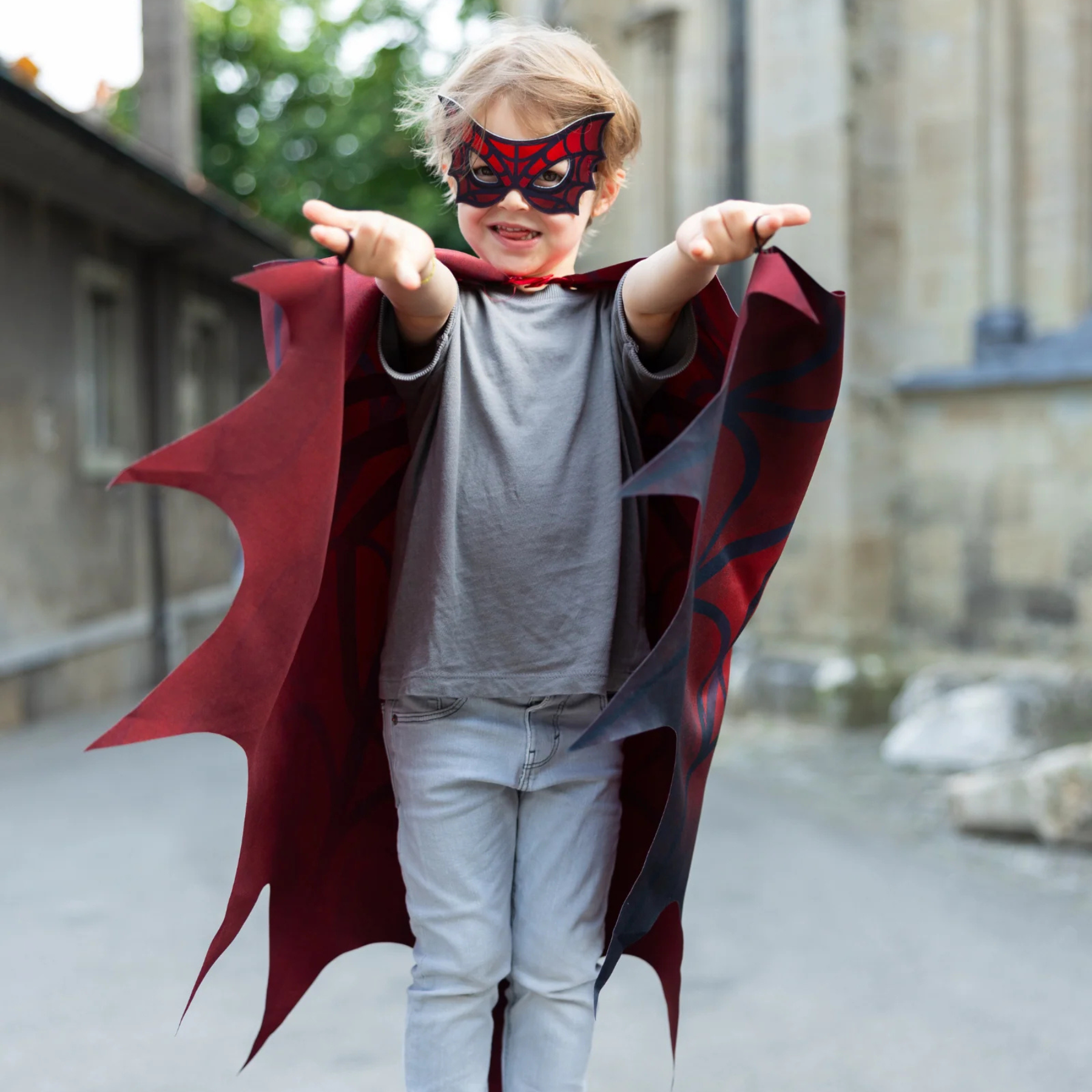 These bold red and black wings feature a striking spider design across the back, with web-inspired details that make every leap, run and jump feel like a rooftop adventure. The dramatic pointed edges give the look of real webbed wings in motion, while the soft lightweight fabric keeps playtime comfortable for hours of heroic missions.