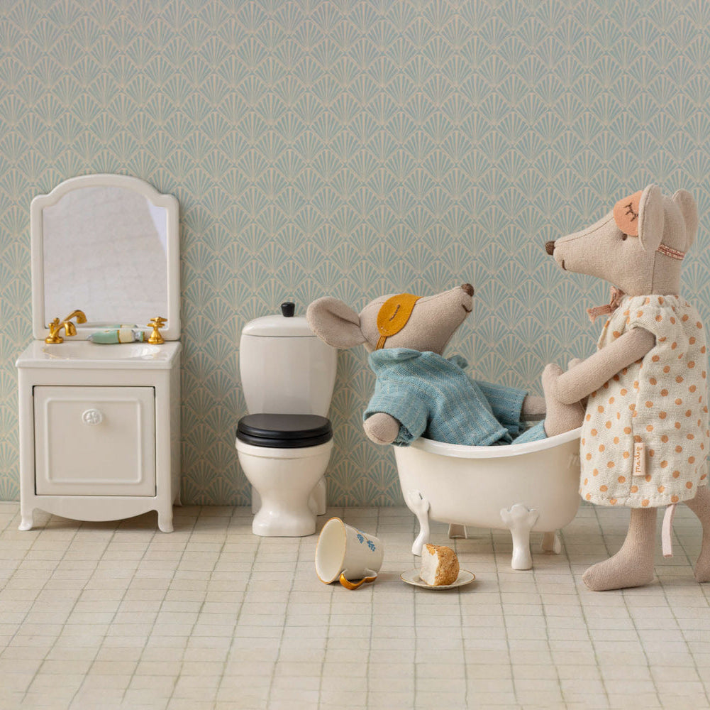 With a little cupboard beneath the sink, your mice can store their tiny towels, soaps, and bathroom treasures – everything they need to stay squeaky clean! Pair it with the Maileg toilet and bathtub to create the ultimate mouse bathroom full of imaginative play. A must-have piece for magical routines and everyday make-believe moments.