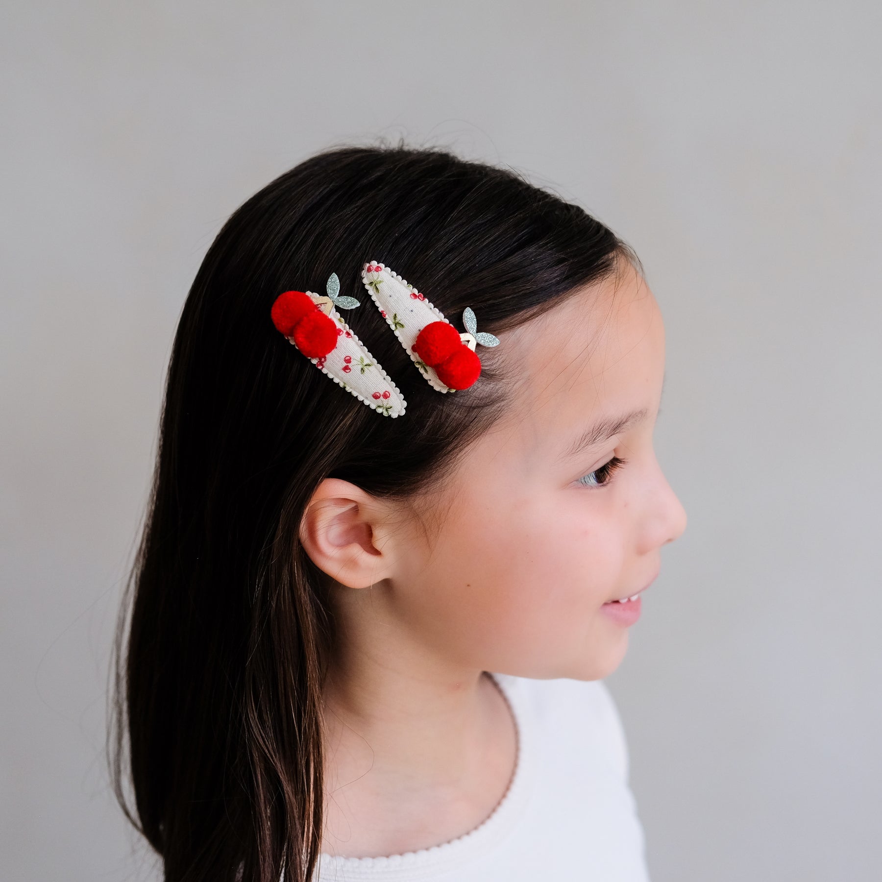 - Includes a pack of 2 cherry-print fabric–covered clic clac hair clips (approx. 5 cm), topped with soft red pom pom cherries