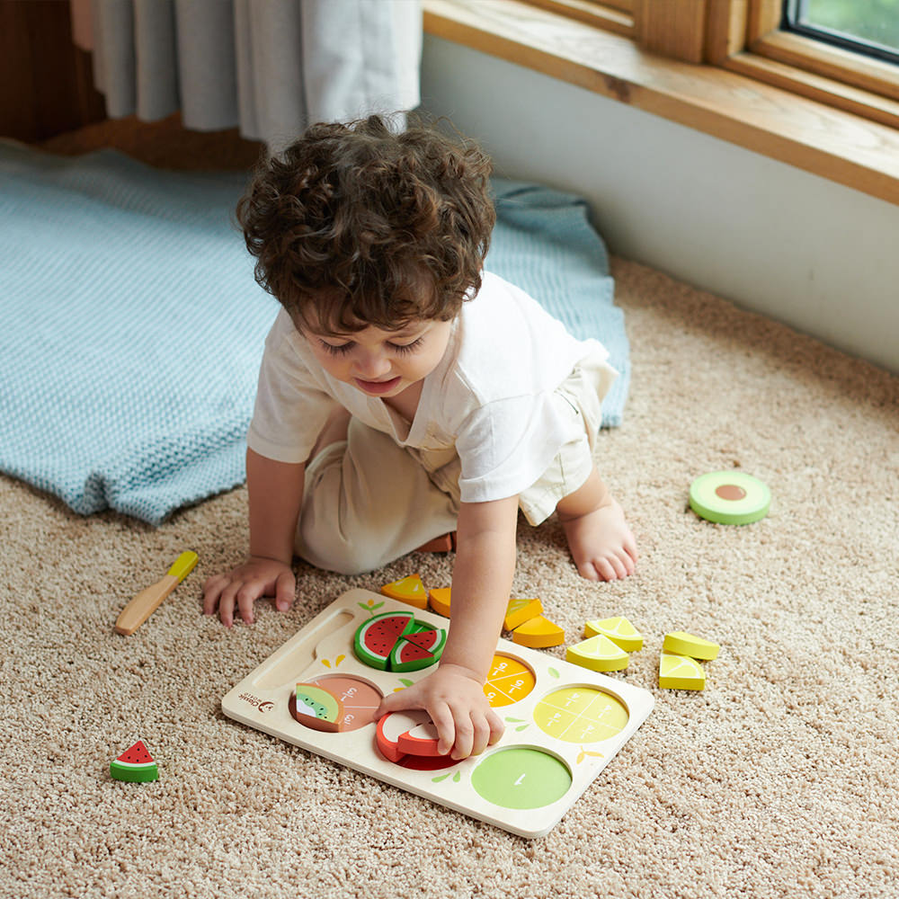 Each fruit is cleverly divided into halves, thirds and more, helping children visualise fractions as they play. Whether they’re “cutting” a lemon into slices, sharing a watermelon or piecing an apple back together, little learners begin to understand parts and wholes in a fun and intuitive way.