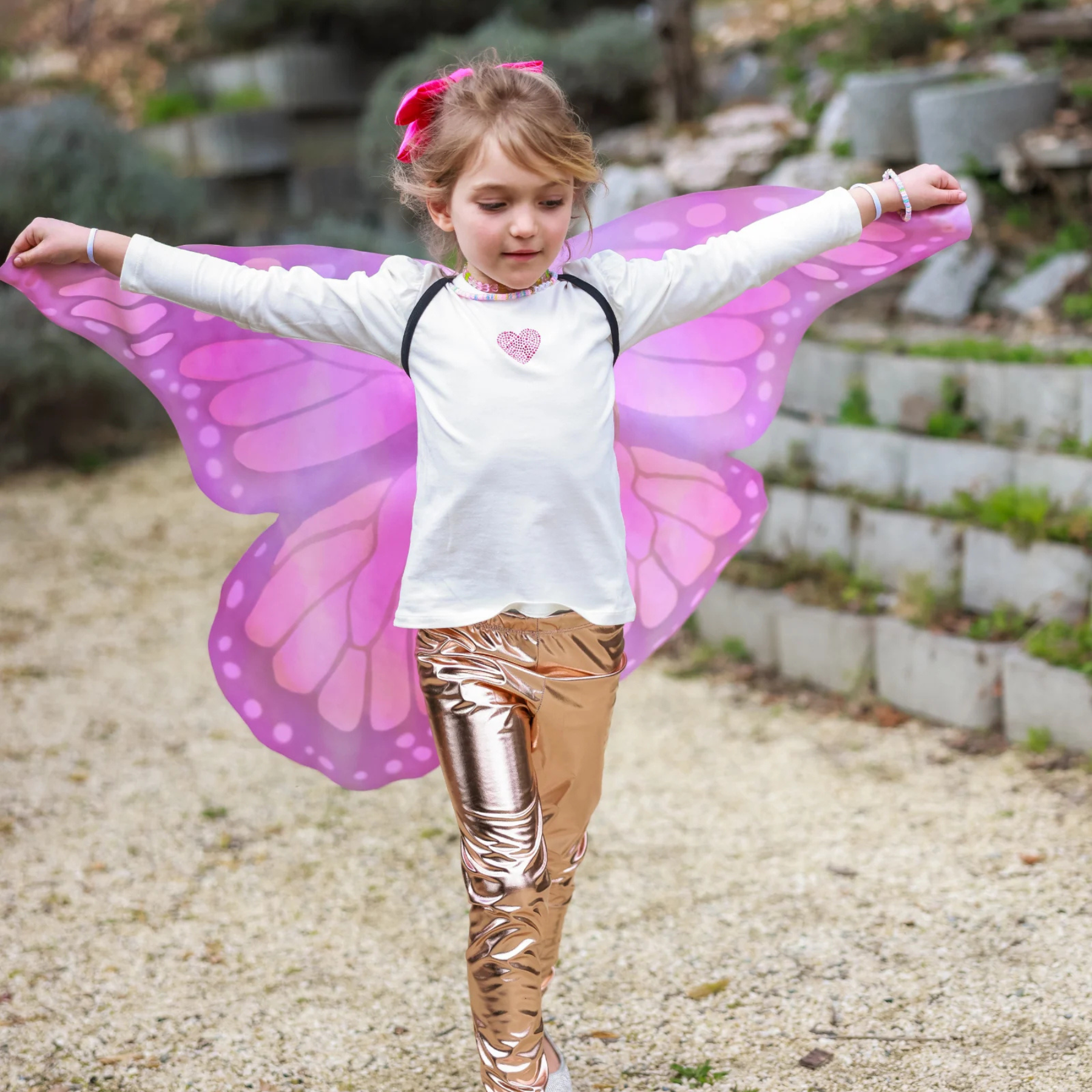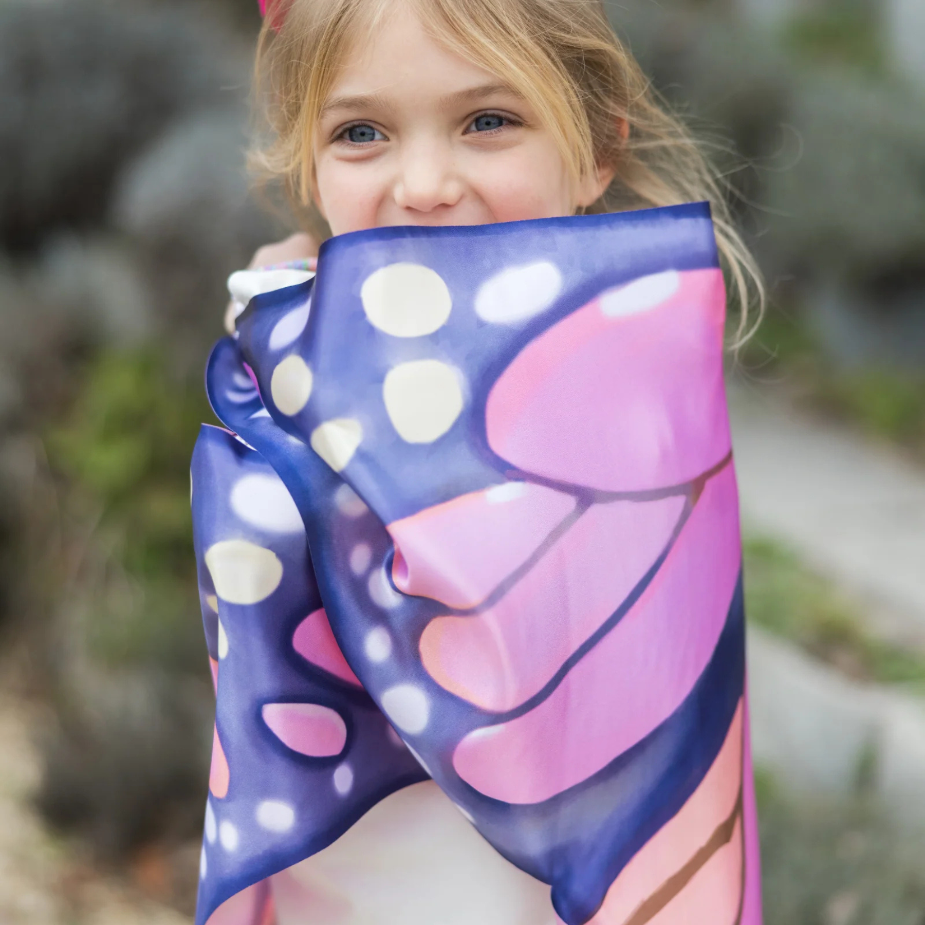 Beautifully detailed with hand-drawn monarch patterns and rich, vibrant colours, these wings instantly transform playtime into a garden adventure. Lightweight and soft, they move gently with every step, making running, spinning and soaring feel effortless and natural – just like butterfly wings in the breeze.