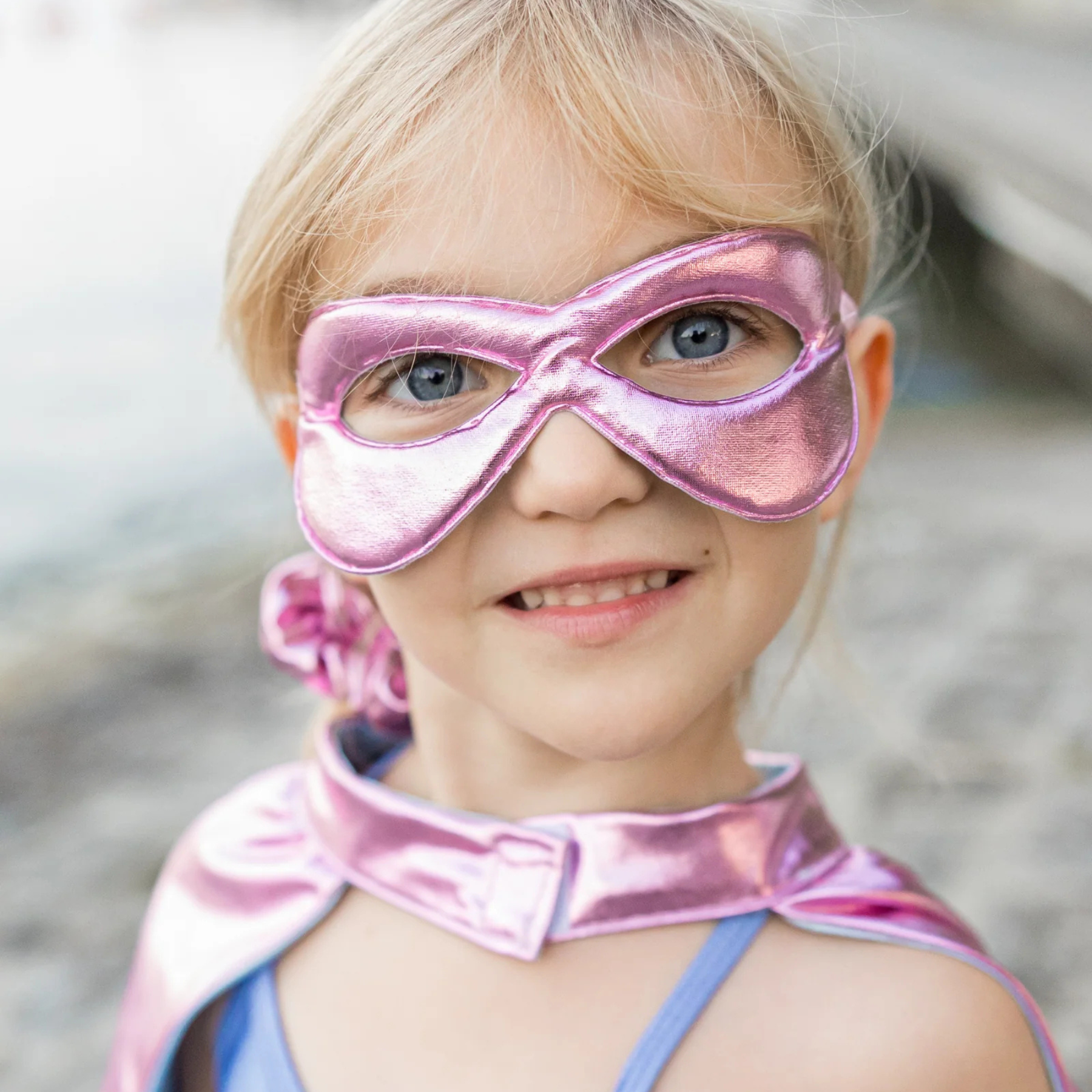 The shimmering metallic pink cape flows behind every brave mission, finished with a soft blue lining and a bold star emblem worthy of any superhero. A matching eye mask keeps secret identities safe, while the magical tutu steals the show – layered in dreamy blue and pink tulle that swishes and twirls with every leap into action.