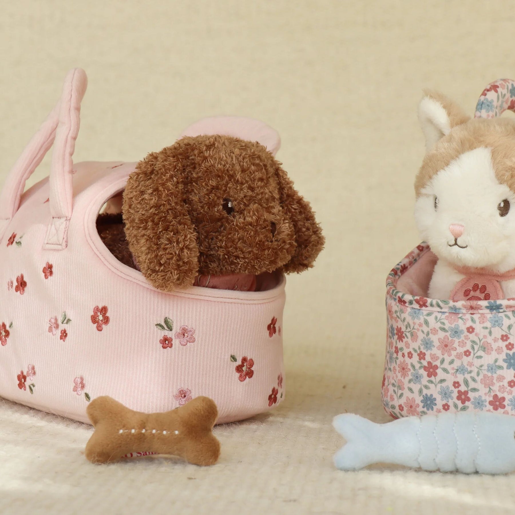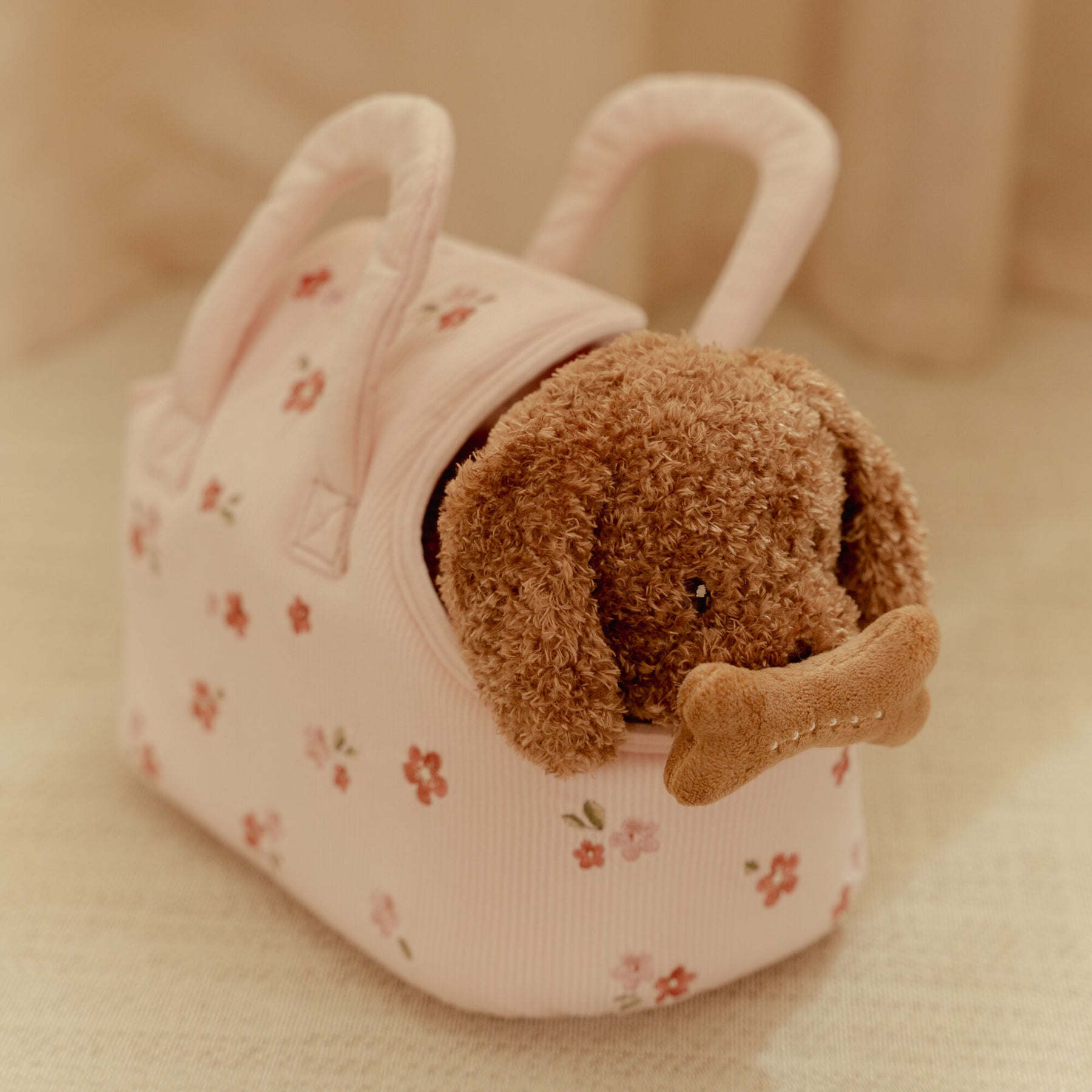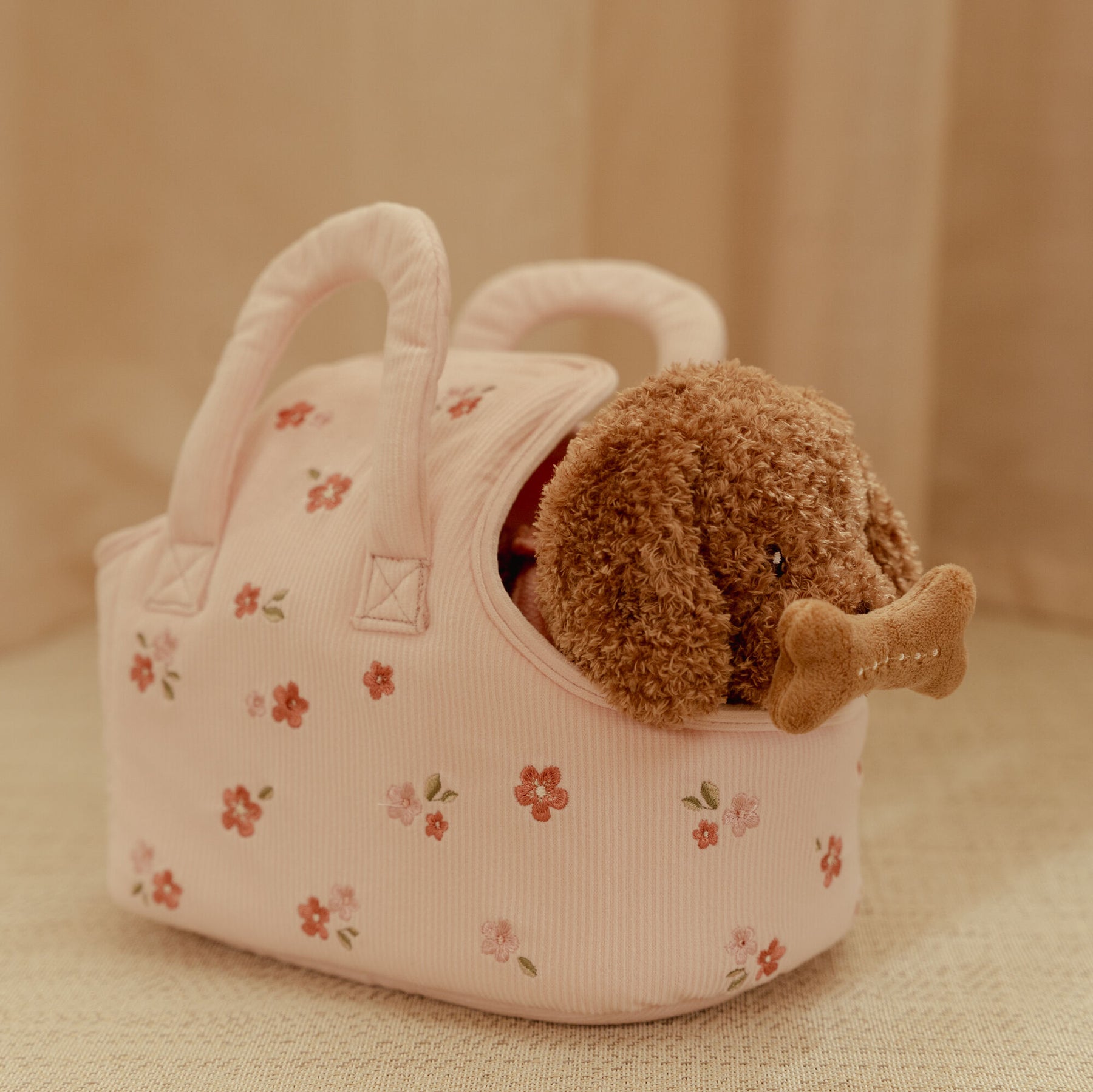 With her soft, fluffy coat and gentle, friendly face, Jackie is made for snuggles and imaginative play. She peeks curiously out of her charming floral carry bag – ready to explore the world by your little one’s side, whether it’s a trip around the house or a pretend outing to the park.