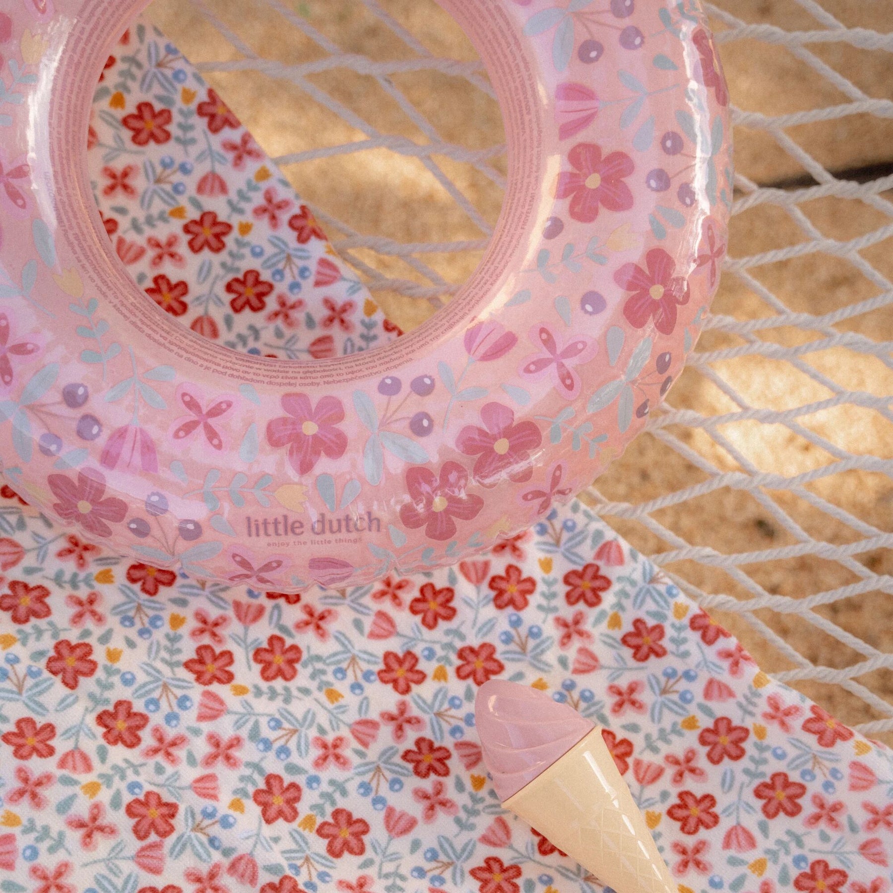 The Little Dutch Inflatable Swim Ring – Pink Flowers brings a touch of sweetness to every seaside stroll and poolside paddle.