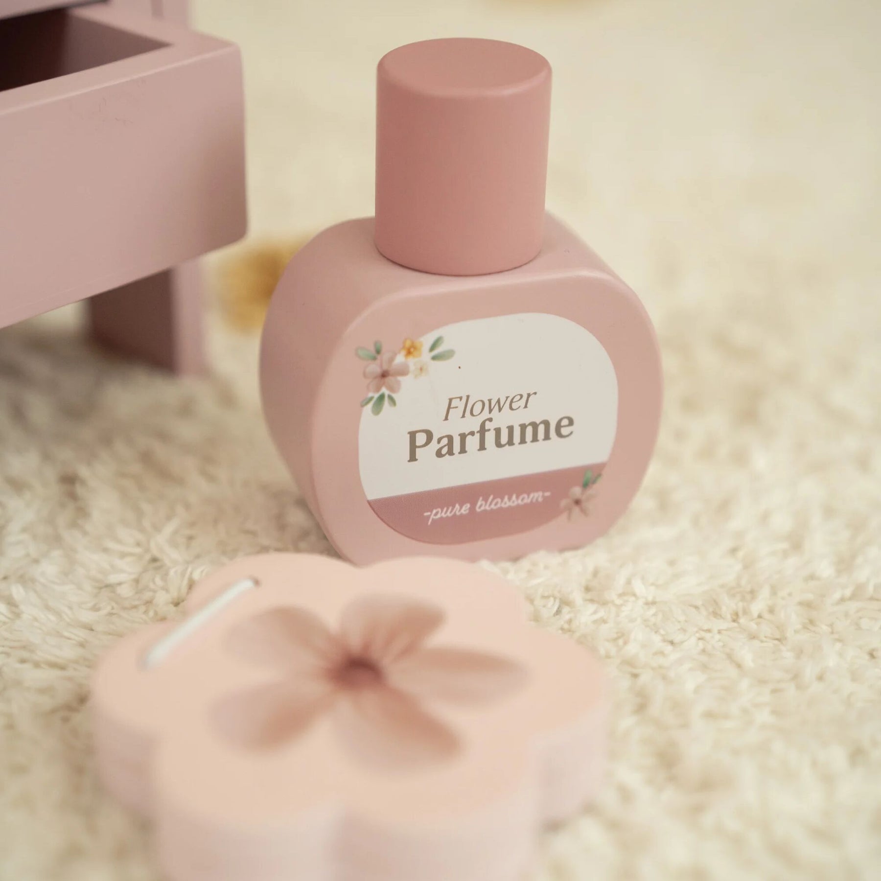 Featuring a large mirror for styling perfection and a handy pull-out drawer to neatly store beauty treasures, this sweet vanity is perfectly sized for play on the floor or atop a table. Complete with beautifully crafted wooden accessories – including a perfume bottle, eyeshadow palette, and lip gloss – your little one will have everything they need to create their most glamorous looks.