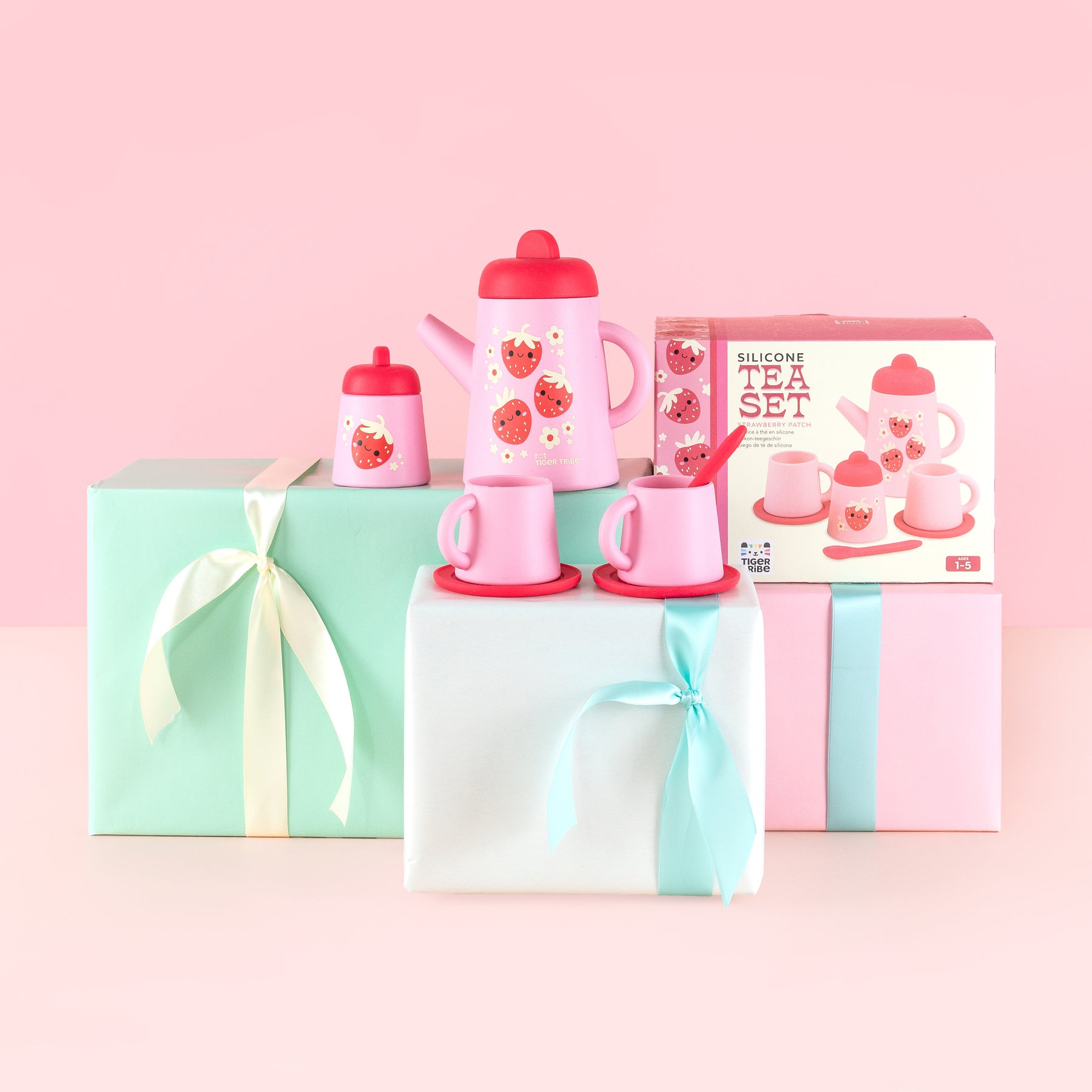 Silicone Tea Set – Strawberry Patch by Tiger Tribe. Pour, pretend and play the sweetest make-believe moments with the Tiger Tribe Silicone Tea Set – Strawberry Patch! Bursting with charm and sprinkled with smiley strawberries, this adorable 9-piece set brings endless joy to little hosts who love a good tea party.