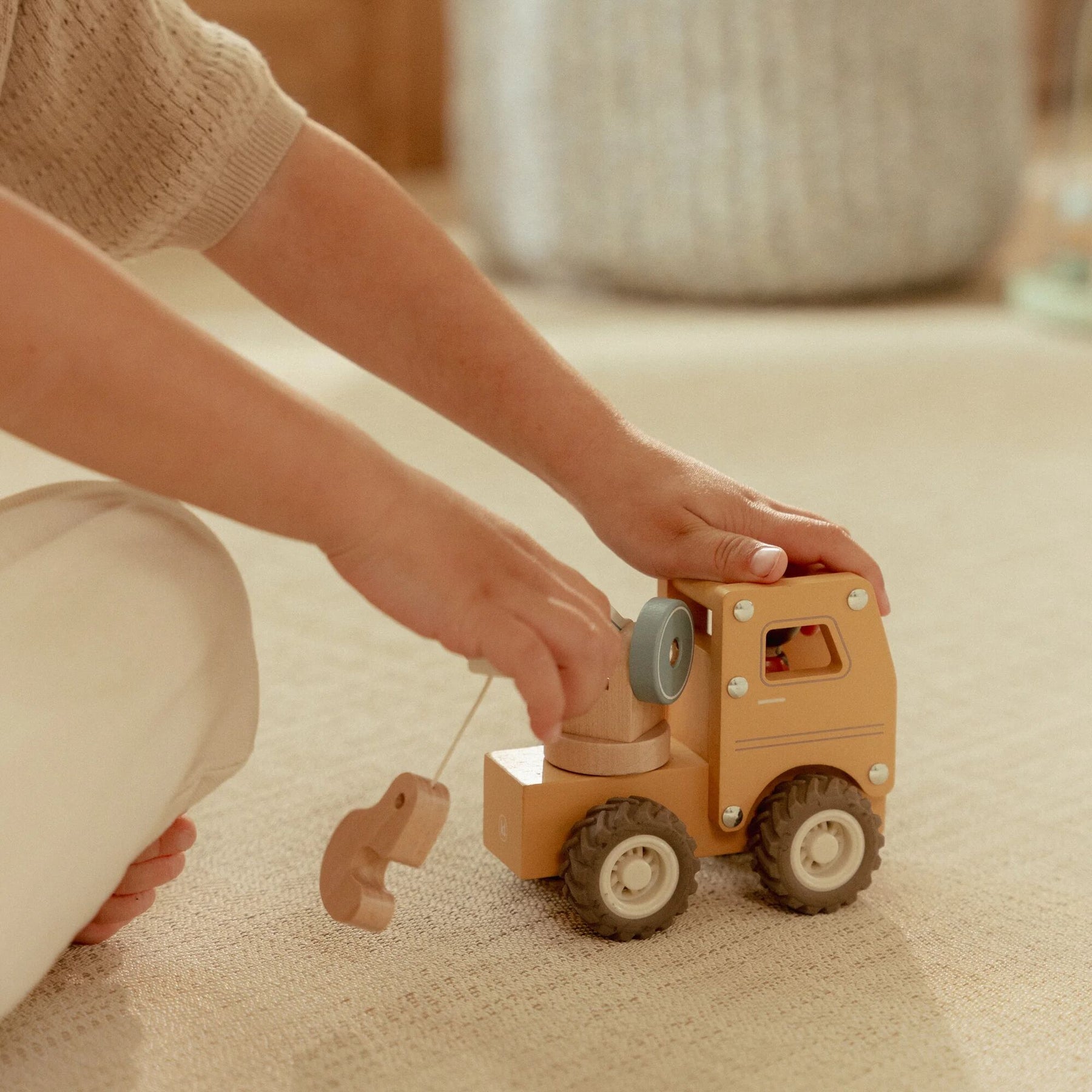 Featuring soft, modern colours and chunky rubber wheels for smooth rolling, the sturdy wooden truck is perfectly designed for little hands to grip, push, and manoeuvre. The moveable crane arm and working hook add an extra layer of interactive fun – letting little builders lift and lower loads just like a real construction pro.