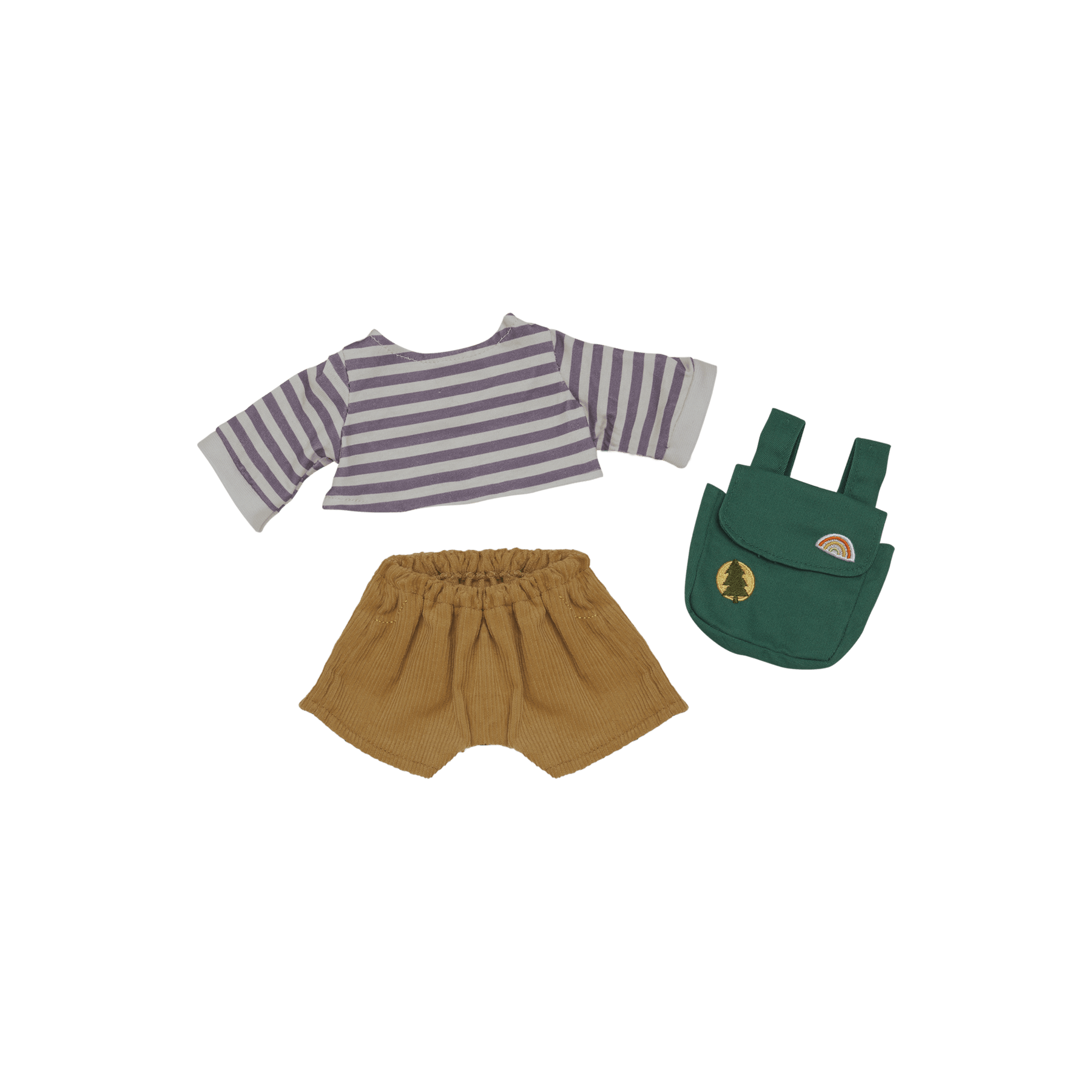 Dinkum Doll Rambler Outfit by Olli Ella. For little explorers with big imaginations! The Dinkum Doll Rambler Outfit is made for mossy trails, secret forts and treasure hunts that only the keenest eyes can see. With a soft striped jersey top, cozy corduroy shorts and the tiniest working backpack, your Dinkum Doll is ready for adventures that start before breakfast and end with muddy knees and happy hearts.